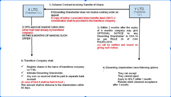 The first clause of this provision explains that in a situation where the scheme or contract involving the transfer of a set number of shares to another company has within 4 months of making that offer, been approved by at least 9/10th of the shareholders, then the acquiring company needs to give a notice (Form CAA 14 Rule 26 of CAA Rules, 2016) to the dissenting shareholders within 2 months after the expired 4 months.