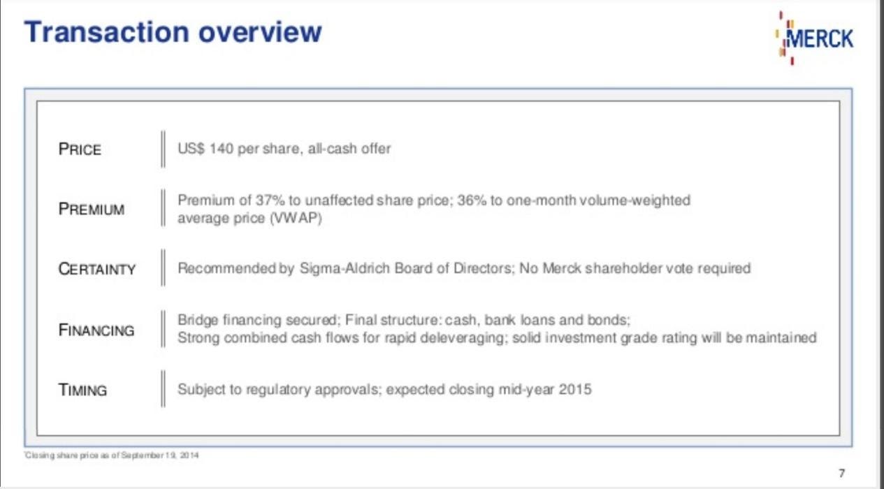 One of the condition that the transaction was subjected to the the approval of the shareholders of the Sigma-Aldrich that was done with a whopping 78% as the shareholders were getting a handsome premium of approximately 37% also the acquisition for the group was unanimously been approved by the Board of Sigma-Aldrich in September.