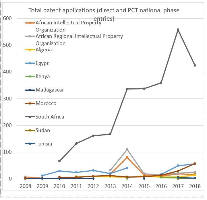 There has also been a trend of filing patent applications originating in China Mainland before African countries and in the regional Patent Offices, ARIPO and OAPI. The Total Patent Applications (direct and PCT national phase entries) from WIPO statistics show a massive predominance of Chinese patent applications in South Africa (2540 patent documents), followed by patent applications in Egypt (278), ARIPO (227), OAPI (168), Morocco (149), Algeria (69) and Kenya (12).