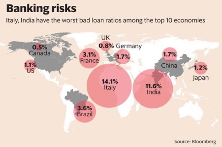 - Non Performing Assets – The biggest risk that can be assessed are the rise in bad loans. Bad loans are loans which are not repaid back by the borrower. Hence, they are a total loss for the bank. India’s public-sector banks control about 70% of all the banking assets in the country and they account for the highest exposure to bad loans amounting to USD 150 billion. Banks should focus on the cleaning up of their loan portfolio.