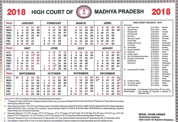In order to deal with the pendency of cases it is necessary that the courts are open throughout the year, however, calendar of Supreme Courts (which is also applicable to other courts) provides week-long vacations each for Holi, Dussehra, Muharram, and Diwali along with the fortnight-long winter vacations. Let’s take a look at the calendar of Madhya Pradesh High Court.