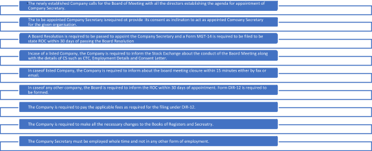 Timeline within which a Company Secretary is appointed should be in the first Board Meeting of the newly incorporated company.