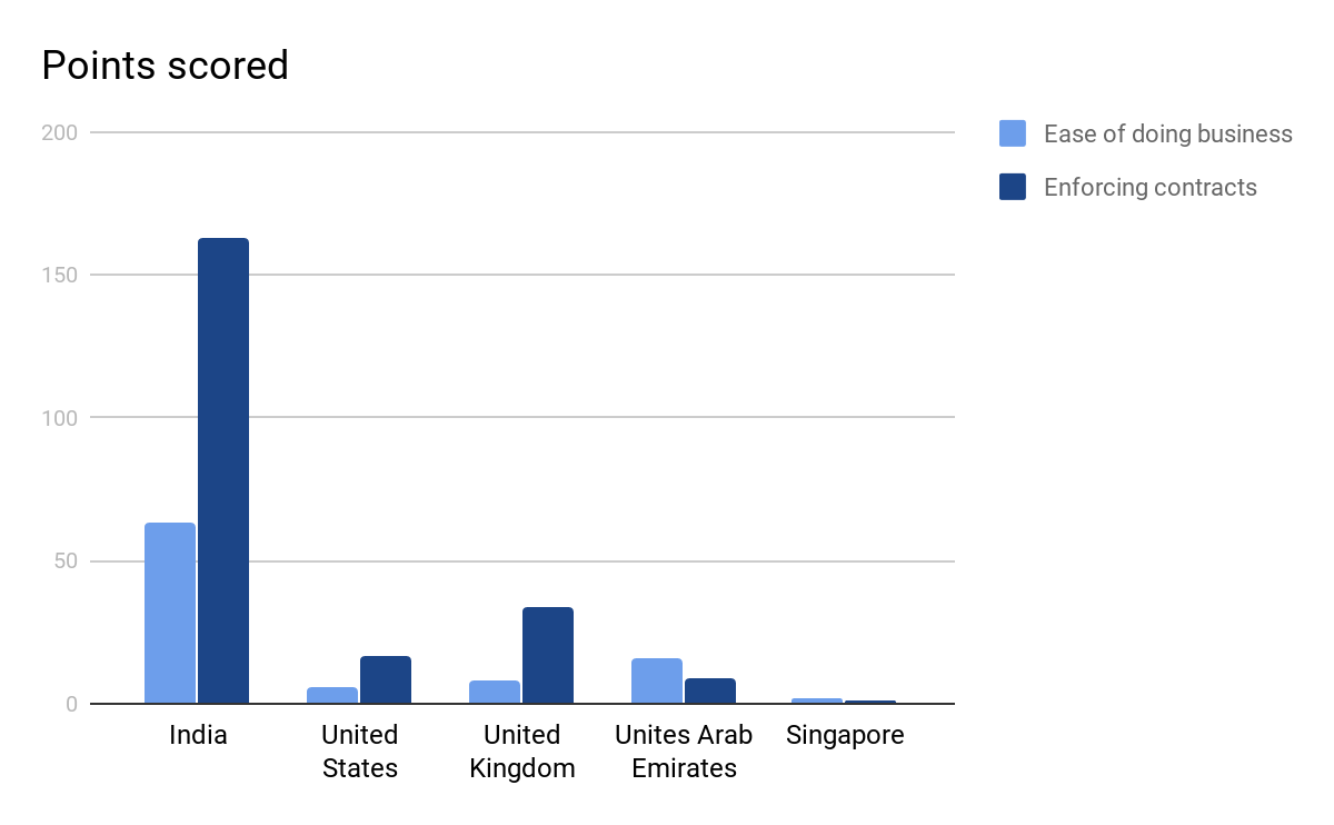 According to 2019 rankings, India has gained 63th rank out of 190 countries, while the United states ranked 6th, United Kingdom ranked 8th, United Arab Emirates ranked 16th and Singapore ranked at 2nd place for Ease of doing business 2019. On the other hand, India has a very lower ranking in Enforcement of contracts, that is, 163, while it may have improved in comparison to before, it is still very low. Singapore ranks at 1st place. Similarly, other countries ranks in enforcement of contracts are as follows: