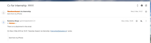 Some students forget to attach their resume but call to follow up! What are they expecting? A reply from the internship manager stating you forgot to attach your CV. Unfortunately, people are busy, and nobody reads your internship applications as a full-time job. People will just ignore your emails if you make mistakes and if they get many such mails.