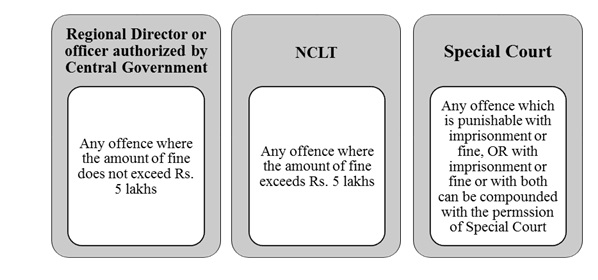 Any offence punishable with fine only and where the maximum amount of fine which may be imposed for such offence does not exceed five lakh rupees may be compounded by the Regional Director. Any offence punishable under this Act with fine only and where the maximum amount of fine which may be imposed for such offence exceeds five lakh rupees may be compounded by the NCLT. The offences which are punishable by fine or Imprisonment; fine or Imprisonment or with both may be compoundable with the permission of Special Court. The same has been represented below:companies dispute resolution