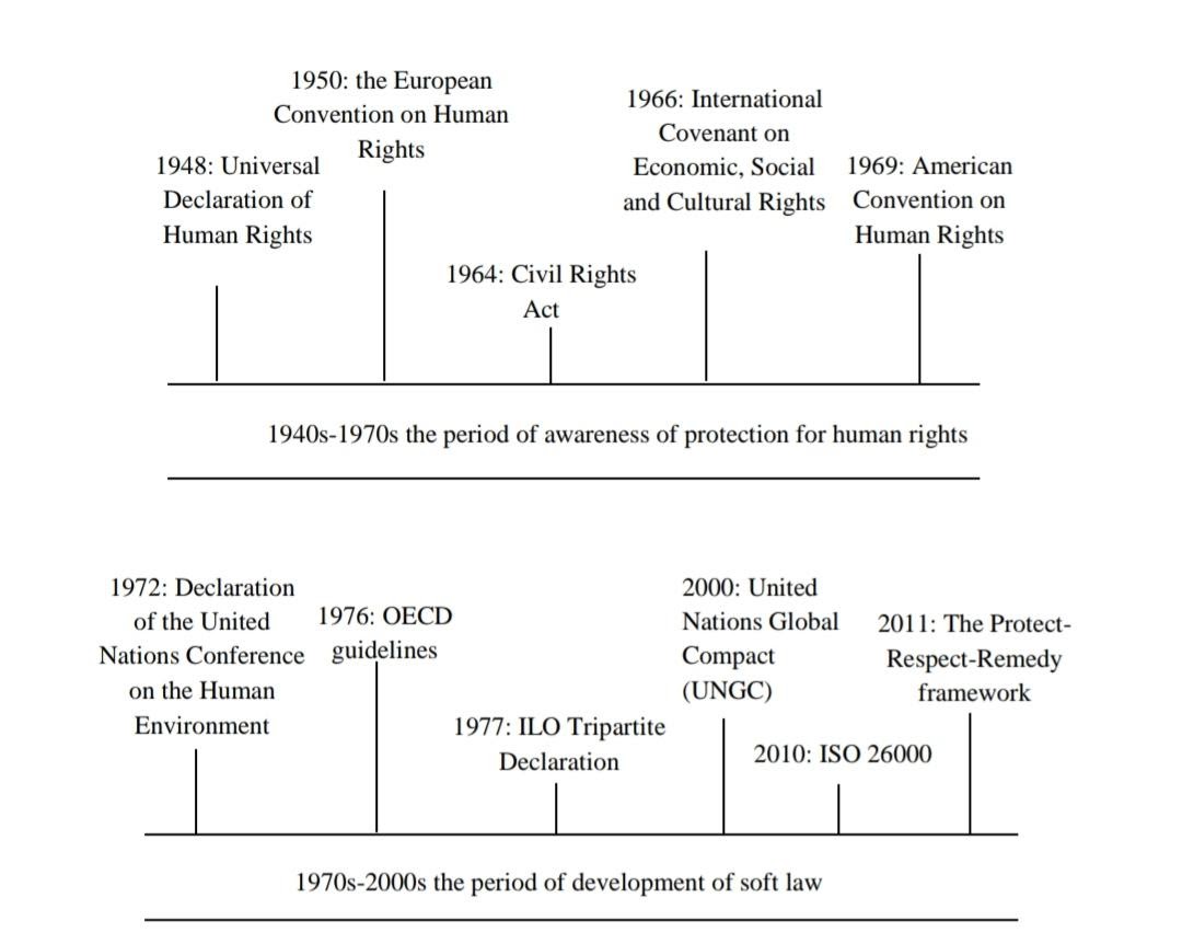 UDHR states that “every individual and organ of society has responsibility to strive to promote respect for these rights and freedoms and by progressive measures, national and international, to secure their universal and effective recognition and observance”. The corporations are crucial organ of any society thus holds responsibility as well. The following figure displays the development of guidelines from UDHR (1948) to Protect- Respect- Remedy Framework (2011).