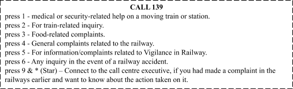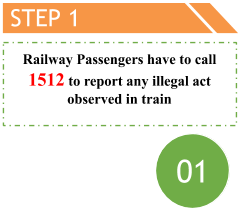 The Government of India has launched all India Railway Helpline Number 1512. Passengers can report any illegal act observed while travelling in trains instantly and get an FIR registered without interrupting their journey. The special thing about this service is that it will not only register the complaint, but also informs the Government Railway Police guards present on the train and the local police station of the area. The helpline also facilitates one-to-one communication between the on-duty policemen and passengers in distress, who complain on the helpline.