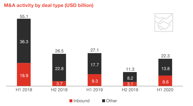 Since the second half of 2018, M&A deals in India have been witnessing a decline with a significant decrease towards the end of 2019 due to various global and domestic concerns. The pandemic also brought to halt many economic activities. Despite the hardships, in the first half of 2020 India saw a 19% increase in the value of investment activity compared to the second half of 2019. However, compared to the first half of 2019, there was a 14% decline in the value of investment activity. Inbound activity, i.e., when a foreign company acquires or merges with a domestic company, amounted to USD 9 billion in the first half of 2020. The data showing a decline of M&A deals since 2018 is as follows[1]: