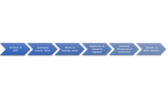 Further, as per an analysis of the Paint Sector Report, decorative paints segment was expected to witness better growth going forward from 2020 onwards. The fiscal incentives given by the government to the housing sector have incalculably benefited the housing sector. This will profit key players in the long term and the market for India paints and coatings is expected to expand at a CAGR of 8.56% during the forecast period of 2019 – 2024. Mounting demand from the construction industry, united with rising infrastructure activities, is driving the demand for the market studied. It can be seen that Asian paints did not only globalise its market audience, but also diversified its product line in a horizontal manner.