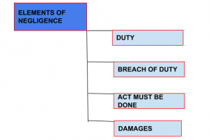 • Duty: For committing a negligent act, there must be some duty on the part of the defendant. Here it is important to understand whether the defendant has taken legal duty of care towards the plaintiff.