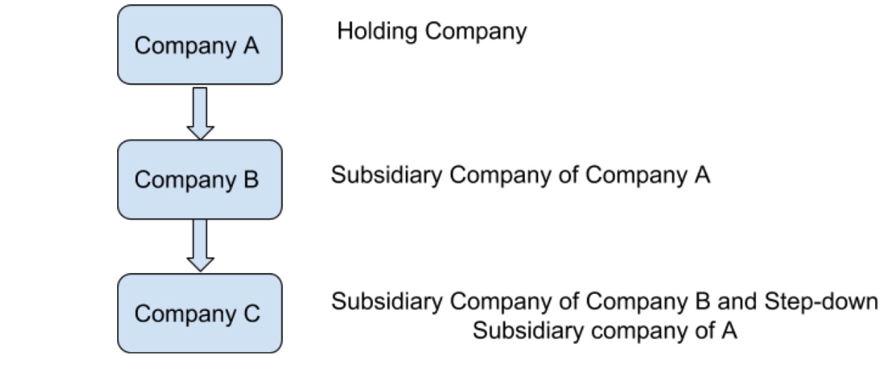 - As company B is wholly owned subsidiary of company A, it will not be considered separately as a layer. Therefore, it can be said that in the given illustration, holding company A has 3 step down subsidiaries or layer companies i.e. company C, D and E.