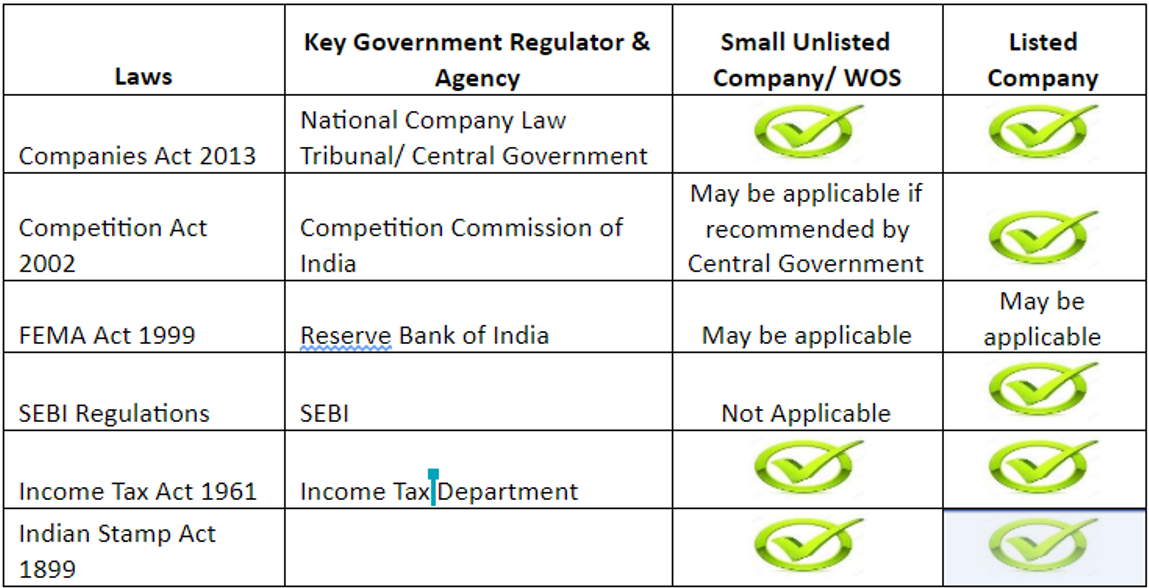 Mergers are governed by the following key laws and regulators in India. The key differences between mergers in listed and non listed companies arise due to compliance to provisions of Companies Act and requirements and compliance to SEBI regulations. While compliance to SEBI regulations does not arise for merger/ demerger of 2 non listed companies, when a non-listed company merges/ de-merges from a listed company or vice-versa SEBI regulations kick in.