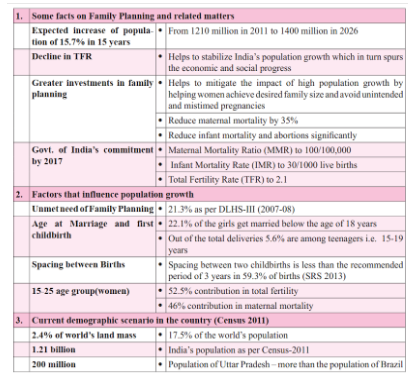 The table shows the plan of the central government to control the population growth and the current position of the sub-continent.