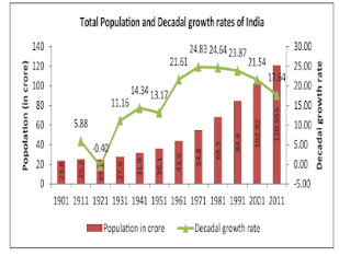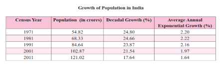 It is no doubt that the figures in table 4.2 show that there is a constant rise in the population of the country from 1971 (54.82 Crores) – 2011 (121.02 Crores). But a careful look at the decadal growth rate shows that there is a constant decline of the population growth for a particular growth. Therefore, the government with the help of various awareness programmes and schemes has achieved significant success to control the population but still, a long way has to be travelled for success to come.
