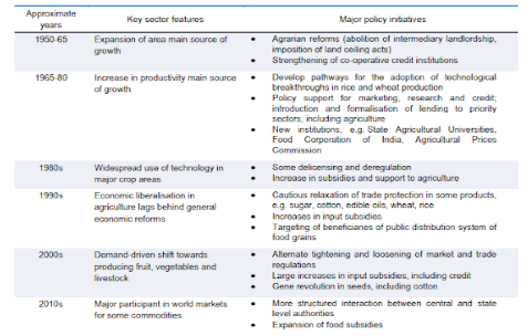The following table shows the key features of the agriculture sector and the policy initiatives taken by the government to reach the same. The following are some policy measures that the government has implemented to improve the conditions of the farmers and the overall development of the agricultural sector: