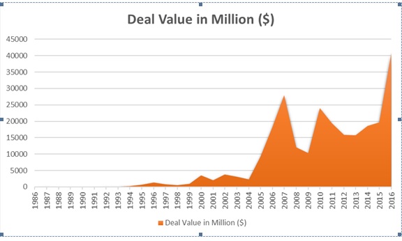 In 2016, a Data Report by Thompson Reuters Eikon shows that Indian Companies’ distressed assets sales have been the highest in the year of 2016 since the liberalization of the Indian Economy. 2016 has seen sale of distressed assets valued at a total of $40.85 billion. A comprehensive chart of the data as collected from 1986 till 2016 (November 7th) has been provided below in Fig 1. This data by Reuters covers the Indian companies’ tangible assets, branches, divisions, operations as well as subsidiaries sold off by parent companies. [6]