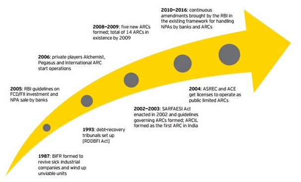 Fig 4. ARC Evolution in India. Source – Assocham India, EY, “ARCs at the crossroads of making a paradigm shift”, July 2016 (http://www.ey.com/Publication/vwLUAssets/EY-ARCs-at-the-crossroads-of-making-a-paradigm-shift/$FILE/EY-ARCs-at-the-crossroads-of-making-a-paradigm-shift.pdf)