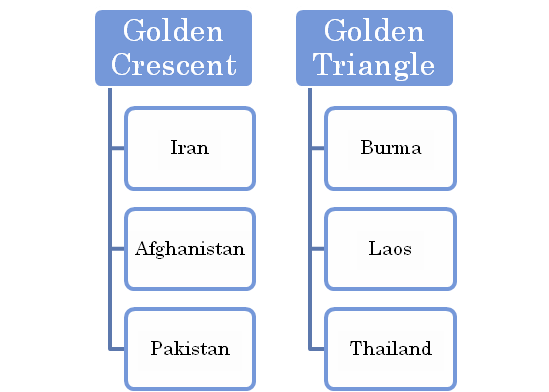 There are various internal and external factors contributing to the drug trafficking scenario in India. The geographical location of India is as such, it makes it vulnerable to transit, trafficking and consumption of Opium derivatives in various forms along the known trafficking routes. One of the major external factors is related to be India’s close proximity to the major Opium producing regions of SouthEast and SouthWest Asia known as the ‘Golden Crescent’ and the ‘Golden Triangle’. A few of the internal factors which are responsible for drug trafficking are illicit cultivation of Poppy and the diversion of Opium sources from the licit sources into illicit production in interior areas.
