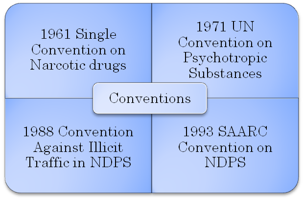There were a number of Central and State enactments i.e., (i) the Opium Act, 1857, (ii) the Opium Act , 1878 and (iii) the Dangerous Drugs Act, 1930. All of these acts were not sufficient for the proper regulation of drugs in India and therefore Narcotic Drugs and Psychotropic Substances Act, 1985 was enacted for the proper enforcement and regulation. This act sets out the statutory framework or the strategy for the drug law enforcement in India, as well as the provisions for the implementation of the various obligations to the International Conventions. The various International conventions to which India is a signatory are: