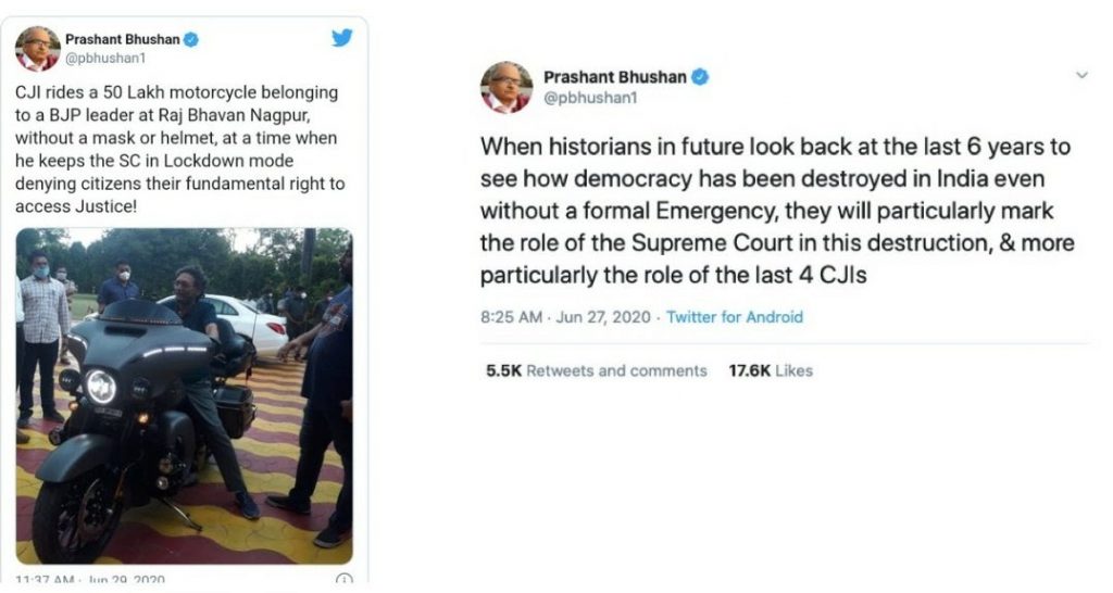 Mr. Bhushan’s first tweet was about a picture of Chief Justice SA Bobde sitting on a 50 Lakh bike belonging to a BJP leader. In the second tweet, Prashant Bhushan shared an opinion on the role played by the last four Chief Justices of India in the country’s current democratic situation.