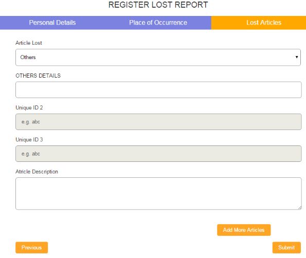 - Under ‘Article Lost’ Section, select the name of the lost article from the drop-down menu. If the lost article is not mentioned in the list then you can select ‘others’ and describe about the article in brief.