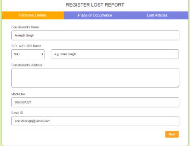 - You will have to enter your personal details like Complainant’s name, son of/ wife of/ daughter of name, Complete Correspondence Address, Mobile No. and E-Mail etc. Then, click on ‘next’ button.