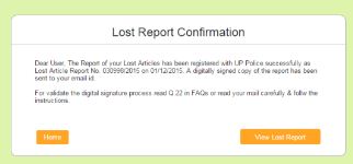 - A digitally signed copy of the FIR will be sent to your registered E-mail address in the PDF format. You can get your Lost Article Report printed and use it for the desired purpose.
