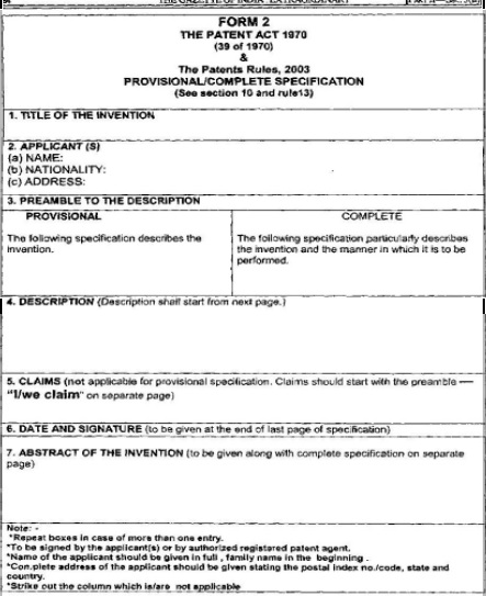 - Form 2 (Provisional Specifications), THE PATENTS ACT 1970 (39 of 1970) and THE PATENTS RULES, 2003.