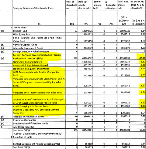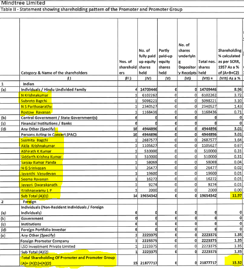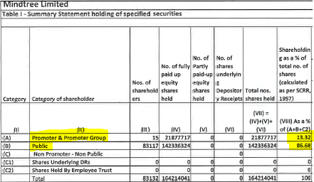 Since we are discussing the distribution of the number of shares held and L&T’s motive of achieving the golden figures of 25% and thereafter by open offer achieve 66% stake in Mindtree. It is worth noting the low percentage of shares held by the promoters 13.32% which may be sufficient to thwart a hostile bid.