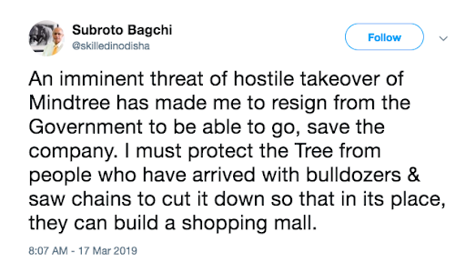 Subroto Bagchi also issued the following dramatic statement on his Twitter account resigning from his post in the Odisha Skill Development Authority to help avert the supposed crisis at Mindtree –