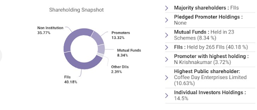 Typically, promoters of a company have been there since the inception of the company and have even helped in the incorporation and drafting of various constitutional documents such as the articles of association and memorandum of association. The promoters of Mindtree include Krishnakumar Natarajan who is the executive chairman, Subroto Bagchi who is the co-founder, Rostow Ravanan who is the CEO and Parthasarathy N.S. who is an executive vice chairman and COO of Mindtree Ltd. They hold a 13.32% stake in Mindtree.