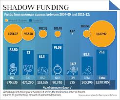 - In a report of Association of Democratic Reforms and National Elections Watch for the year 2004-2005 and 2011-2012, a large amount of donations of Congress (I), BJP, BSP, NCP, CPI and CPI (M) came from ‘unknown sources’ as mentioned by them in the disclosure statement submitted to the Election Commission of India. Such sources were not disclosed on account of them making donations below Rs.20,000/-.