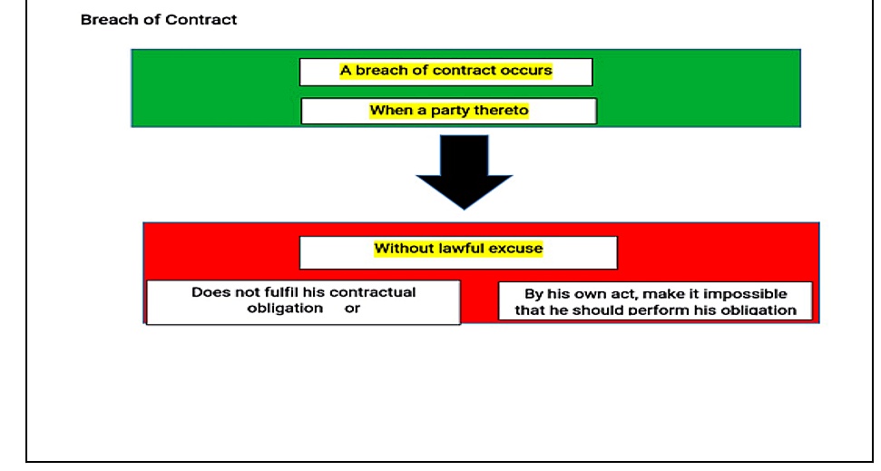 Let us “Breach of Contract” with this example. The date was fixed by both the parties for performing that is on 12th June 2019, the seller will give or make the whole payment and the dealer will pass the car to seller person but suddenly on 7th June 2019, the seller deny from doing the payment before the date of performance. This is known as Breach of Contract. Breach of Contract has 2 kinds of breach-