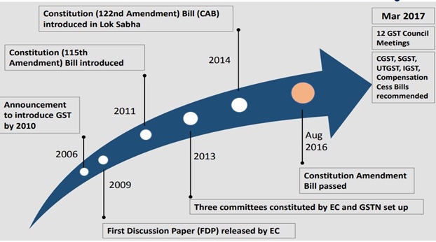 The main efforts for GST has been started in the year 2006 when the UPA government announced the introduction of GST upto 2010 but the new tax regime remained a dream. Then in 2011, the 115th constitutional amendment bill was presented in the Lok sabha for the imposition of GST but the bill was passed in 2014 in Lok sabha as the 122nd constitution bill.After the wait of 2 years, the bill got assent from the Rajya sabha aswell and has been passed in 2016.[1]