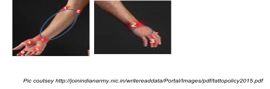 For any other candidate, tattoos are allowed in the following encircled part in the image below. Tattoo should not be obscene or racist or sexist and must respect the army discipline.