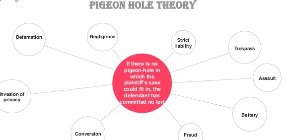 - Salmond theory of torts: Salmond was the supporter of the law of “torts”, according to him the liability under this law arises only when the wrong is covered under one or other nominate torts. This theory is also known as Pigeon hole theory. In order to succeed under this theory, the plaintiff should place the wrong under the already present torts.
