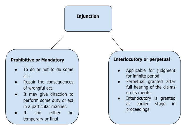 - Injunction: it is granted to refrain the party from further continuing an act. Sometimes damages are not enough to compensate the party, the act which is causing such harm needs to be permanently to be stopped. It is granted at the discretion of the court.