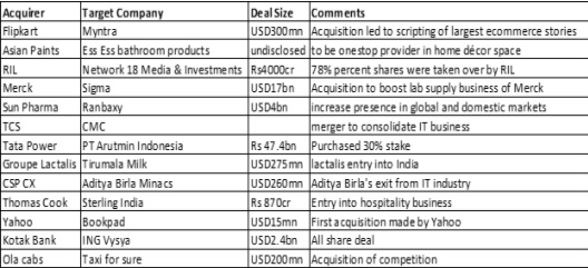 The above data is a tabular representation of recent major merger and acquisition deals in India.