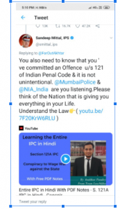 A strange thing happened yesterday. My WhatsApp flooded with messages. Senior IPS officer, Mr Sandeep Mittal quoted my video on Section 121 of the Indian Penal Code over a Twitter War. The Tweet was for Farhan Akhtar on his Statement on organising a rally against the newly amended provision of the Citizenship Amendment Act.