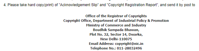 - Post the response copies with the acknowledgement slip and the story/script you want to get the copyright on the address mentioned below the instructions provided by the website i.e. COPYRIGHT DIVISION along with the below-mentioned documents.