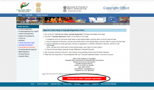 - Apply for an application in “e-Filing of Application” by clicking on “Click here for Online Copyright Registration”.