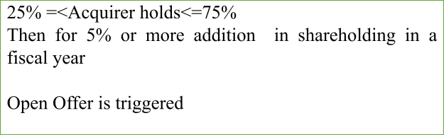 2. When the aggregate of Acquirer’s shares and PAC’s shares is less than 25 % shares initially but exceeds the threshold when the initial holding is calculated in addition to the shares of PAC + shares they want to acquire, an open offer is triggered.