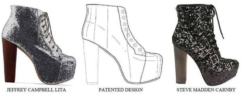 Jeffrey Campbell filed a design patent, trade dress infringement, and unfair competition case against Steve Madden for allegedly replicating the footwear design. According to Campbell, Steve Madden’s Carnby-L shoe design “is believed to be a copy or knock-off of Jeffry Campbell’s Lita Shoe design”.