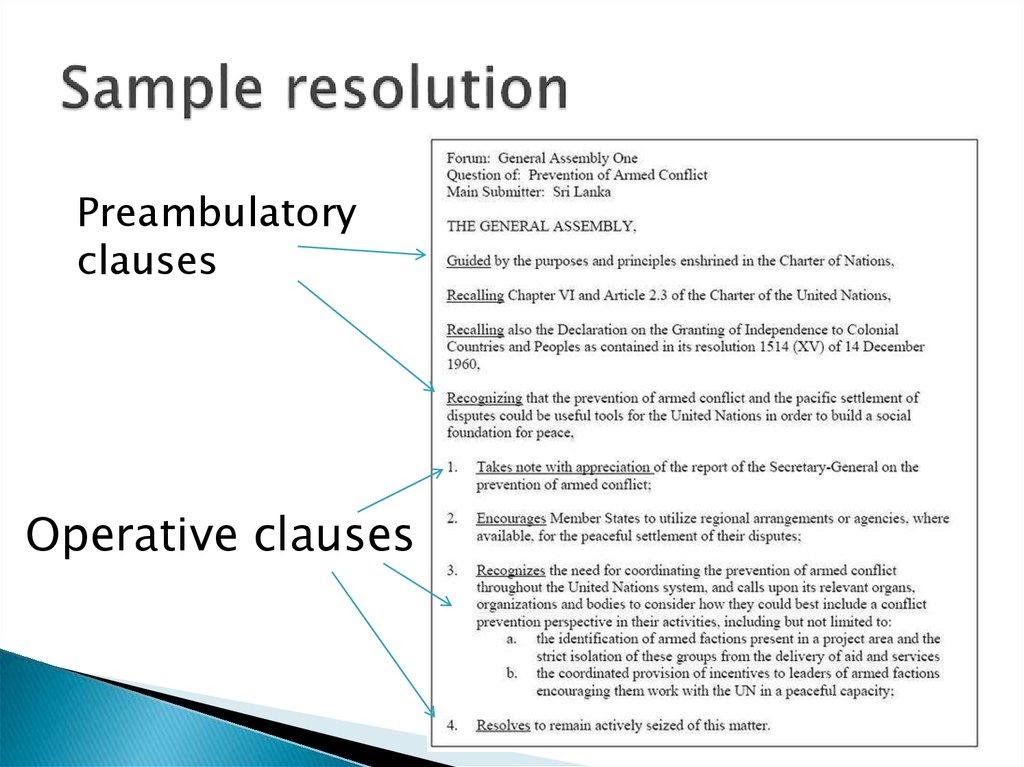 In the model, the clauses are broken into preambulatory and operative clauses. Preambulatory clauses give background, and support about why we are taking functions specified in operative clauses. The operative clauses are written instructions, as a result of which the policy will be implemented practically and will be fully developed by negotiation and lobbying. Each section should cover a different idea, or aspect, and use a sub-clause to further elaborate on several variables or steps.