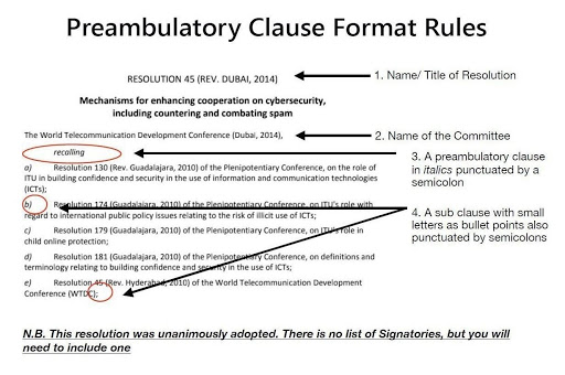 Resolutions are made up of clauses. The clauses are divided into two sections: the Preambulatory Clause and the Operative Clause. Preambulatory tries to outline the issue that is being discussed, and draws attention to any previous attempts and efforts to resolve it. The operative proposes the solution that your country has decided. A resolution can be read as a sentence.