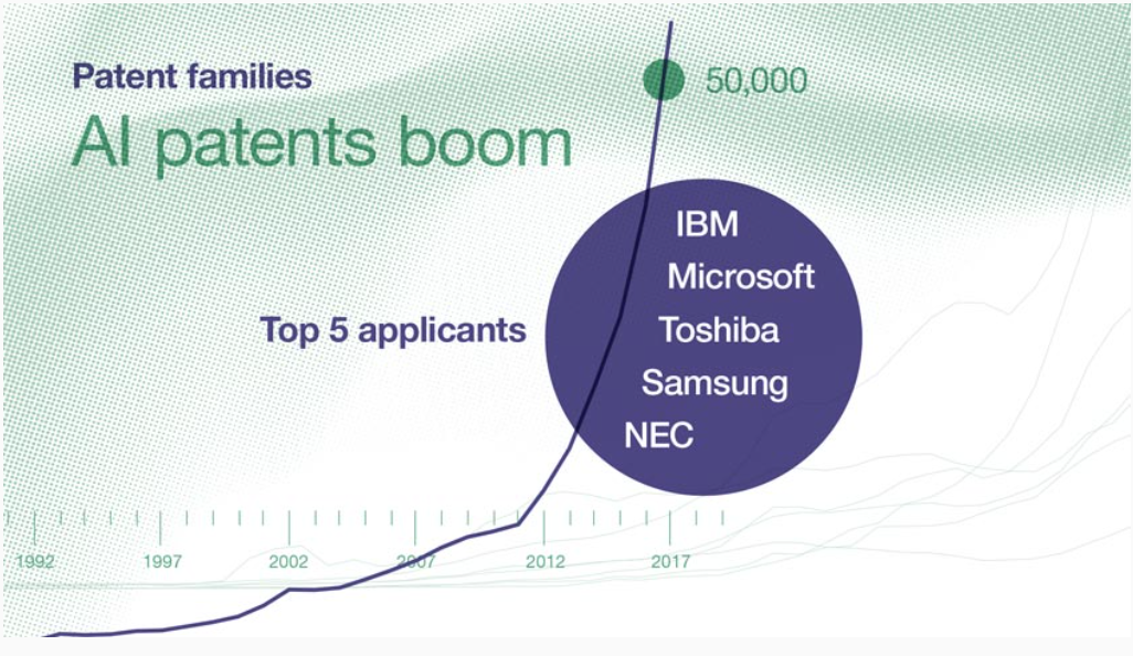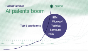 Companies make up 26 of the top 30 applications, with the majority of them working in consumer electronics, telecommunications, and/or software, as well as electric utility and automotive manufacturing. Only four of the top 30 are universities or government-funded research institutes. The firm with the most patents (8,290 applications) is IBM, followed by Microsoft (5,930 applications). Twelve of the top twenty firms are headquartered in Japan, three in the United States, and two in China (according to the 2019 WIPO Technology Trends report). IBM now has the greatest portfolio of AI patent applications, with 8,290 patented inventions and Microsoft comes in second with 5,930 innovations. With 5,223, 5,102, and 4,406 AI patent applications, Toshiba, Samsung, and NEC have the third, fourth, and fifth biggest portfolios, respectively, according to the 2019 WIPO Technology Trends report.