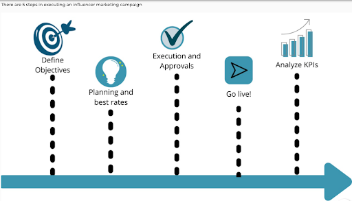 So how exactly does this form of marketing work? Organizations could either hire an influencer to create a short video on their social media page to endorse their product or, collaborate with celebrities that have a huge fan following on social media stirring up a trend amongst consumers. The fundamental steps that go into executing a successful influencer marketing campaign would look something like this: