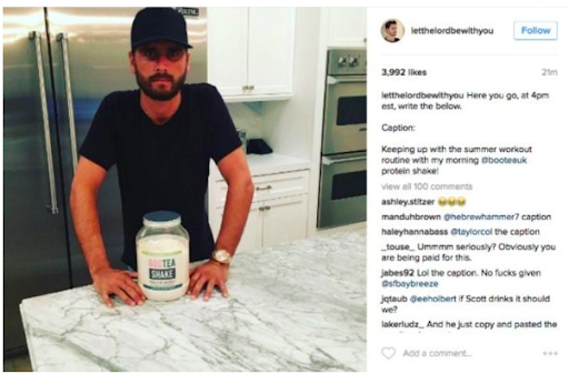 In 2016, celebrity Scott Disik put up a post where he shared a little too much information regarding his commercial relationship with a brand than he intended to. He had simply copy-pasted what was sent across to him and did not review or put his own efforts into the caption. His post read, “Here you go, at 4pm est, write the below: Keeping up the summer workout routine with my morning @booteauk protein shake!” This was what the post looked like: