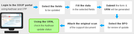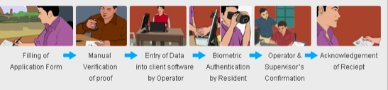 Form filling and acknowledgement is done by the operator on update client as requested by the resident. Handles spelling, language issues, transliteration, etc. Biometric sign off will be provided by the operator after the update request.