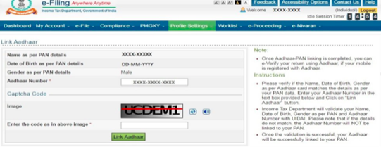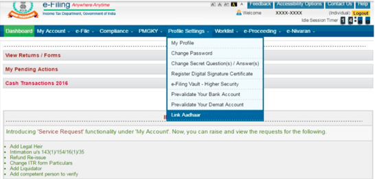 Step 3: When the site is logged in, a pop up window will appear asking you to link your PAN card with Aadhaar card. If you don’t see the popup,then move your cursor to blue tab on the top bar named ‘profile settings’ and click on ‘link aadhaar’.